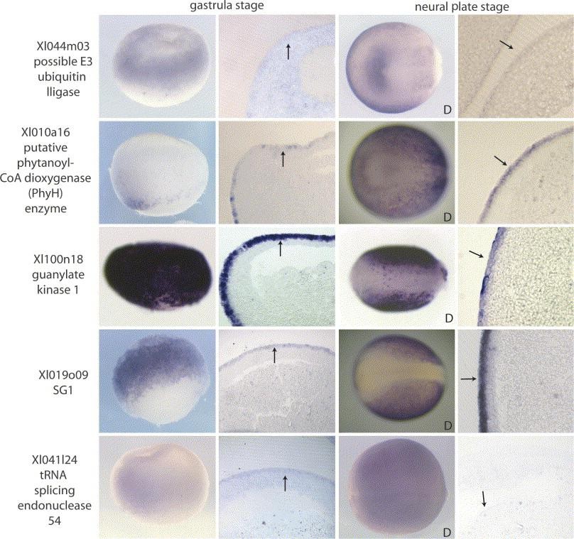 | Larger Image Fig. 5. Genes with superficial expression; Part 5. A wholemount and a section are shown for each gene at gastrula (left-hand panels) and neural plate stage (right-hand panels). The gastrula stage wholemounts have the animal hemisphere to the top. The sections show expression in the animal hemisphere. The stage 14 wholemounts are shown as lateral (L) or dorsal views (D) as indicated with anterior to the left. The stage 14 sections are transverse and show expression in the epidermis except for tRNA splicing endonuclease 54 which is sagittal and shows some weak expression in the archenteron. Arrows indicate areas of expression. The genes are labelled with the top blast hit and unique EST identifier (e.g., Xl044m03). Image published in: Chalmers AD et al. (2006) Copyright © 2006. Image reproduced with permission of the Publisher, Elsevier B. V.