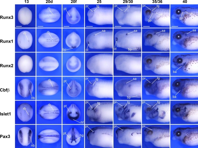 Larger Image Fig. 3. Comparative analysis of the expression of Runx and Cbfβ genes by whole-mount in situ hybridization. Runx3 is first detected at stage 20 in two domains, the developing primary sensory (Rohon-Beard) neurons and the trigeminal-profundal placode. At the same stage Cbfβ is also co-expressed in both domains, while Runx1 is restricted to Rohon-Beard neurons. At later stages, stage 25 and up, Runx3 expression appears to be largely confined to the head region and in a number of cranial nerves including the ganglion of the trigeminal, vagal and glossopharyngeal nerves. To confirm the tissue-specific expression of Runx genes, we also performed in situ hybridization for Pax3 and Islet1 in staged matched embryos. Pax3 and Islet1 share common expression domains with Runx genes in the profundal-trigeminal placode (Pax3 and Islet1), Rohon-Beard sensory neurons and cranial ganglia (Islet1). Stages are according to Nieuwkoop and Faber (1967). Stage 13, dorsal view anterior to top. Stage 20d, dorsal view anterior to the left. Stage 20f, frontal view dorsal to top. Stage 25â40, lateral view of the head region, anterior to the left and dorsal to top. ba, branchial arches region; bp, blood progenitors; hf, heart field; hg, hatching gland; gp, glossopharyngeal; nb, neural plate border; ol, olfactory placode; pr, profundal ganglia; rb, Rohon-Beard neurons; sa, statoacoustic ganglia; tg, trigeminal ganglia; pt, profundal-trigeminal placode; va, vagal nerve. The scale bars in the upper row represent 500 μm. Image published in: Park BY and Saint-Jeannet JP (2010) Copyright © 2010. Image reproduced with permission of the Publisher, Elsevier B. V.