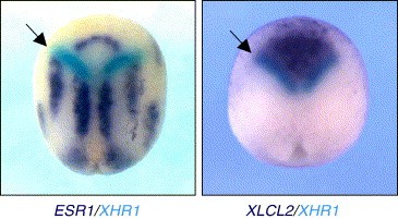 Larger Image Fig. 3. The results of two-color WISH for ESR1 (left column, purple) or XLCL2 (right column, purple) and XHR1 (turquoise). Arrows indicate XHR1 expression in the pre-MHB region. Image published in: Takada H et al. (2005) Copyright © 2005. Image reproduced with permission of the Publisher, Elsevier B. V.