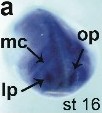 Larger Image vgll4 (vegtigial like 4) gene expression in Xenopus laevis embryo, assayed via in situ hybridization, NF stage 16, anterior view, dorsal up. This image is extracted from figure published in: Faucheux C et al. (2010), Image published in: Faucheux C et al. (2010) Copyright © 2010. Image reproduced with permission of the Publisher, University of the Basque Country Press.