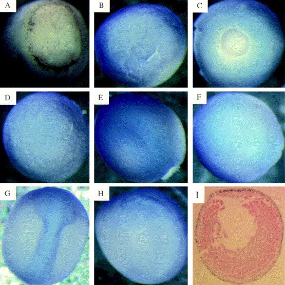 Larger Image Fig. 1. Whole mount in situ analysis of the expression of Xlfc (blue/purple staining). (A,B) Stage 10 (early gastrula) embryos. (A) View of blastopore end, dorsal side lower most. (B) Lateral view, blastopore end to right. (C,D) Stage 12 (late gastrula) embryos. (C) View of blastopore end (posterior). Note even distribution of staining ventral and dorsal. (D) Anterior view. (E,F) Stage 14 (neurula) embryos. (E) Dorsal view, anterior top right; posterior bottom left. Note staining becoming concentrated in the dorsal (neural) ectoderm. (F) Ventral view. (G,H) Stage 18 (late neurula) stage. (G) Dorsal view, anterior top. Staining is now predominantly in the neural tube. (H) Lateral view, dorsal to right. (I) A 10-mm central transversal section through a late gastrula stage (12) albino embryo. The dorsal side is uppermost. Note that only the outer (ectodermal) cells are stained (brown). The section has been counter-stained red. Image published in: Morgan R et al. (1999) Copyright © 1999. Image reproduced with permission of the Publisher, Elsevier B. V.