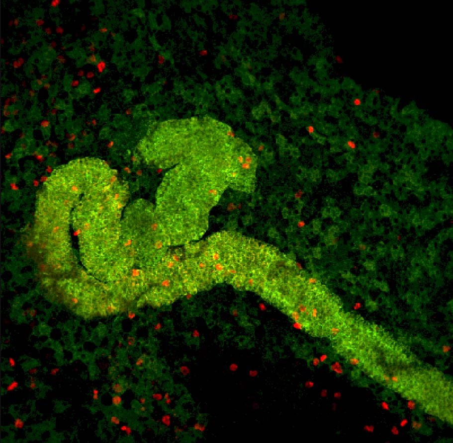 Larger Image Stage 40 Xenopus laevis pronephros stained for kidney epithelia in green, and with the h3f3a antibody 1 phospho ser 10 in red to identify dividing cells Image published in: McCoy KE et al. (2011) Copyright © 2011. Image reproduced with permission of the Publisher, John Wiley & Sons. Permanent Image Page Printer Friendly View XB-IMG-80110 |