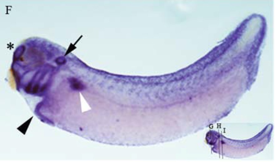 | Larger Image fermt1 (FERM domain containing kindlin 1) gene expression in Xenopus laevis embryos, NF stage 35, as assayed by in situ hybridization, lateral view,anterior left, dorsal up. This image is extracted from figure published in: Canning CA et al. (2011), Image published in: Canning CA et al. (2011) Copyright © 2011. Image reproduced with permission of the Publisher, John Wiley & Sons.