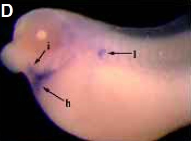 Larger Image csrp3 (cysteine and glycine-rich protein 3 (cardiac LIM protein)) gene expression in a Xenopus laevis embryo, NF stage 40, as assayed by in situ hybridization. Lateral view: anterior left, dorsal up. This image is extracted from figure published in: Duan LJ et al. (2003), Image published in: Duan LJ et al. (2003) Copyright © 2003. Image reproduced with permission of the Publisher.